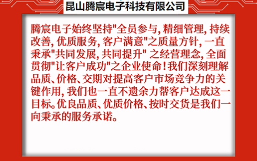 昆山騰宸電子科技有限公司位于中國線路板加工之都昆山千燈,公司專注于電路板研發設計、PCB抄板、元器件采購、SMT貼片加工、組裝測試,為客戶提供一站式電子制造服務。騰宸電子始終堅持"全員參與,精細管理,持續改善,優質服務,客戶滿意"之質量方針,一直秉承"共同發展,共同提升" 之經營理念,全面貫徹"讓客戶成功"之企業使命!我們深刻理解品質、價格、交期對提高客戶市場競爭力的關鍵作用,我們也一直不遺余力幫客戶達成這一目標。優良品質、優質價格、按時交貨是我們一向秉承的服務承諾。 ...